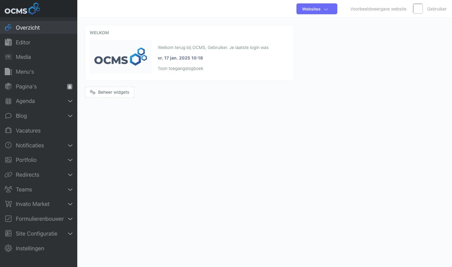 Na het inloggen kom je direct in het OCMS-backend-dashboard. Hier kun je content beheren, instellingen aanpassen en meer.